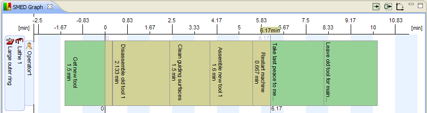 Screenshot of the SMED-graph with the SMED-type set for each task. With this sequence the preparation takes 1.5 min, the internal resetting 8.17 minutes and the reordering after the resetting 2 minutes. The information can viewed in numerical form in the SMED result window.