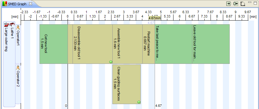 Screenshot of the SMED graph with a second person supporting operator 1 during a part of the resetting.