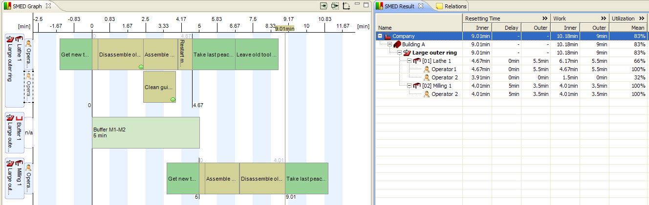 Screenshot of the SMED graph of two connected machines with a 5 minute buffer in between. To right is the SMED result with the line selected. The delay caused by the buffer appears in the SMED graph as well as in the SMED result.