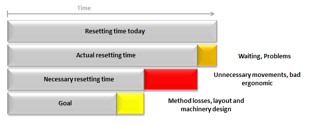 Why is it important to analyze the resetting /changeover process? – The answer is that most processes are vitiated with different types of waste. Evaluating a resetting process related to the time it takes can look like this: